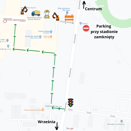 Rozpoczął się remont ulicy L. Okulickiego, przy której mieszczą się nasze dwa budynki. Jeśli wybieracie się Państwo do nas to proponujemy skorzystać z objazdu i skręcić na skrzyżowaniu z sygnalizacją świetlną przy ulicy Wrzesińska/Cymsa (mapka poniżej).