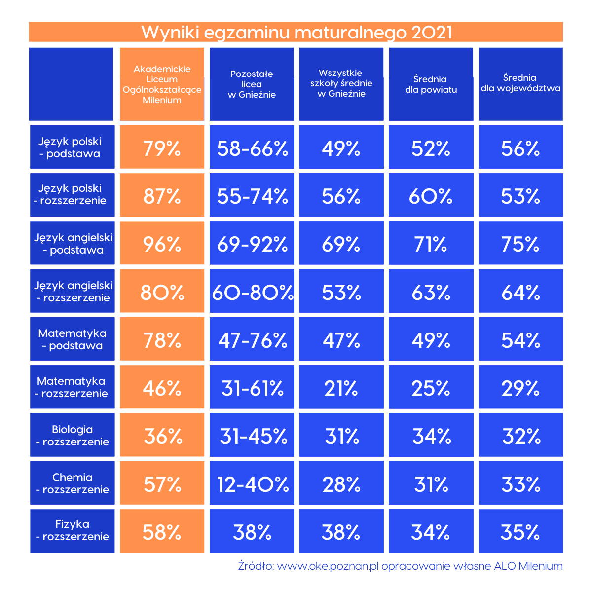 Bardzo dobrymi wynikami może pochwalić się Akademickie Liceum Ogólnokształcące Milenium, które w tym roku ponownie osiągnęło 100% zdawalność. Na 9 egzaminów maturalnych, które odbyły się w podstawie lub rozszerzeniu uczniowie Milenium napisali najlepiej 7 z nich.