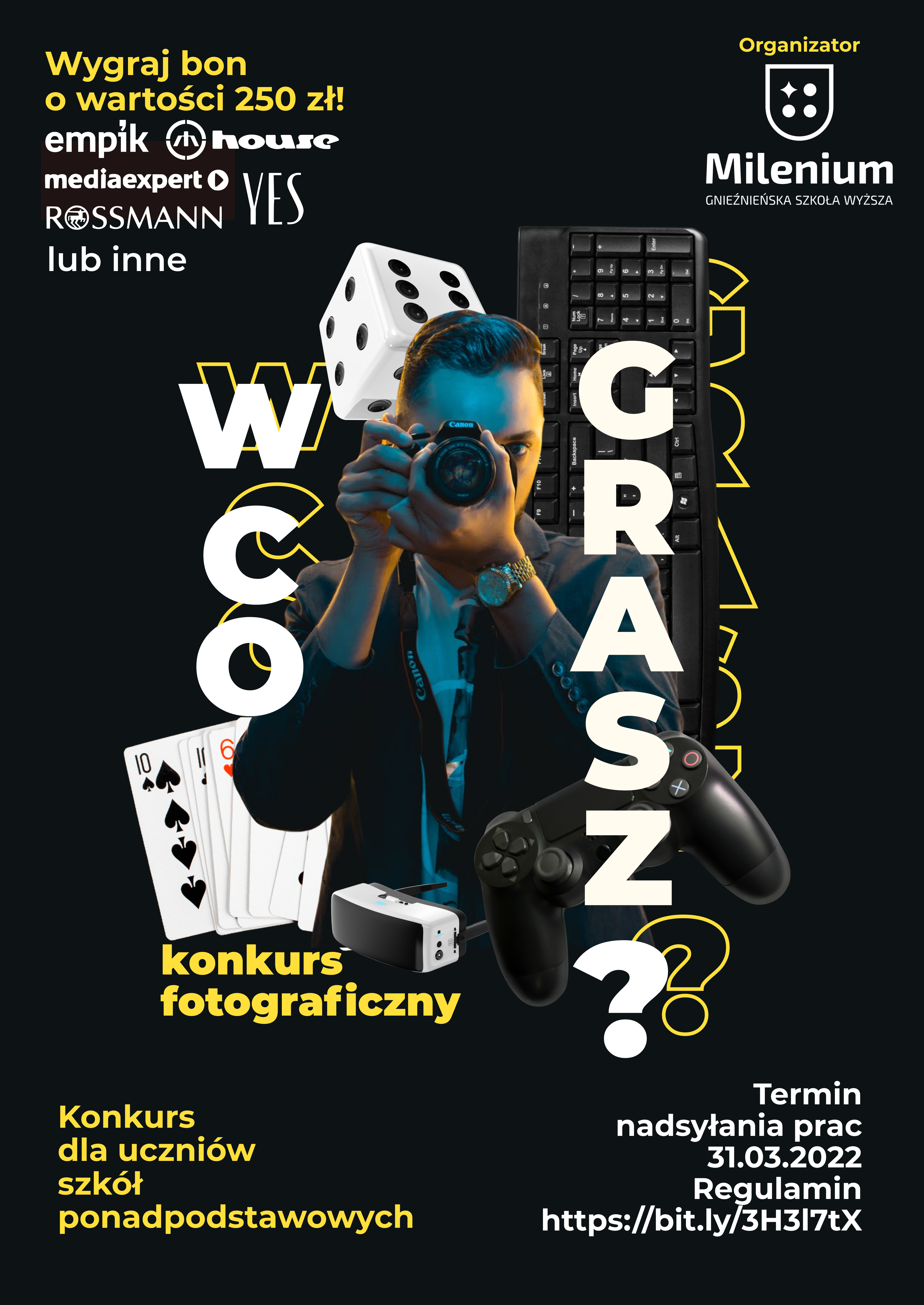 Biblioteka Gnieźnieńskiej Szkoły Wyższej Milenium zaprasza uczniów szkół średnich z Gniezna i powiatu gnieźnieńskiego oraz z Wągrowca i powiatu wągrowieckiego do udziału w międzyszkolnym konkursie fotograficznym "W co grasz?".