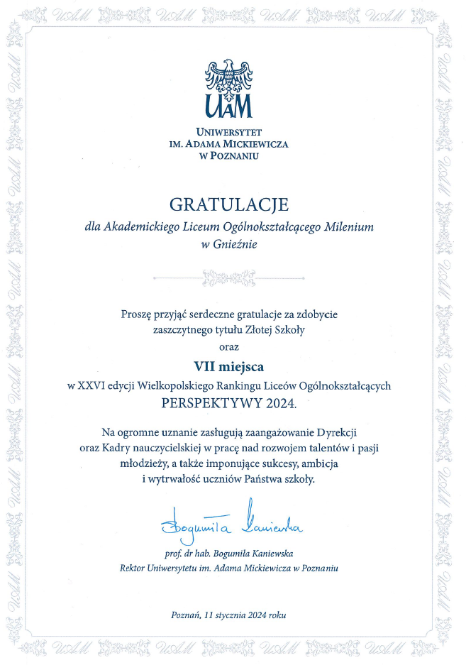 Gratulacje dla ALO Milenium od UAM w Poznaniu
