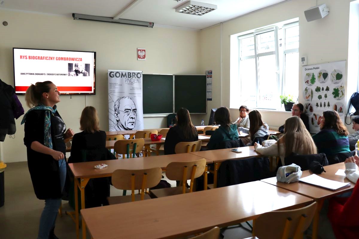 Uczniowie Akademickiego Liceum Ogólnokształcącego Milenium wzięli udział w warsztatach dotyczących języka gombrowiczowskiego. Zajęcia rozpoczęły się krótkim materiałem filmowym, stworzonym przy użyciu aplikacji MyHeritage. Gombrowicz „zaprezentował” swoją biografię i objaśnił cele zajęć.