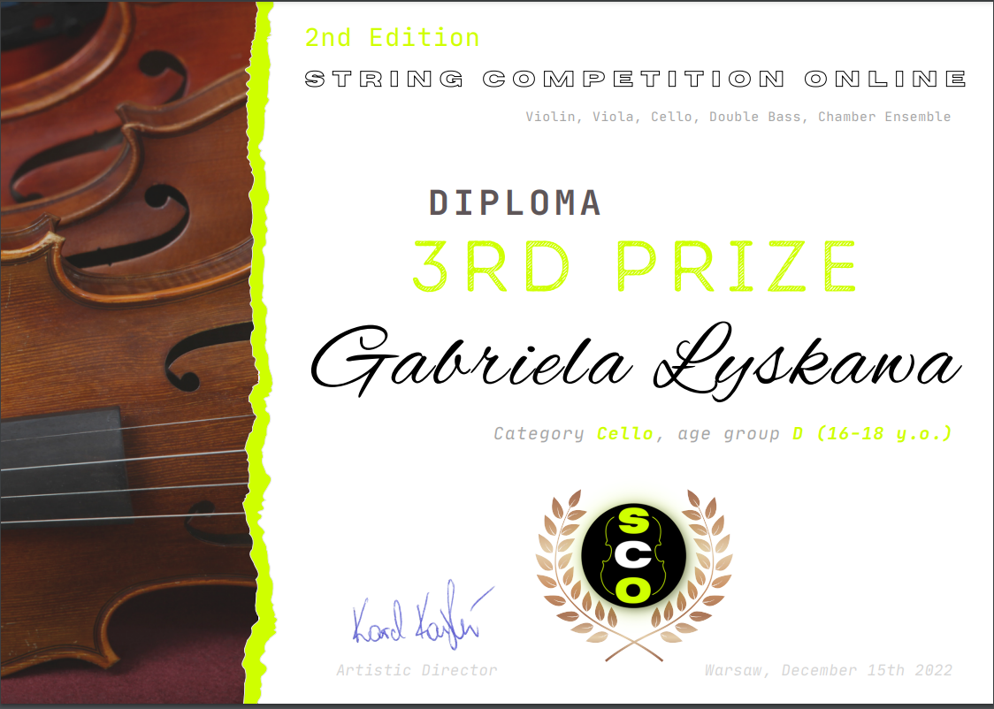 III miejsce Gabrieli Łyskawy w II Międzynarodowym Konkursie Smyczkowym STRING COMPETITION ONLINE