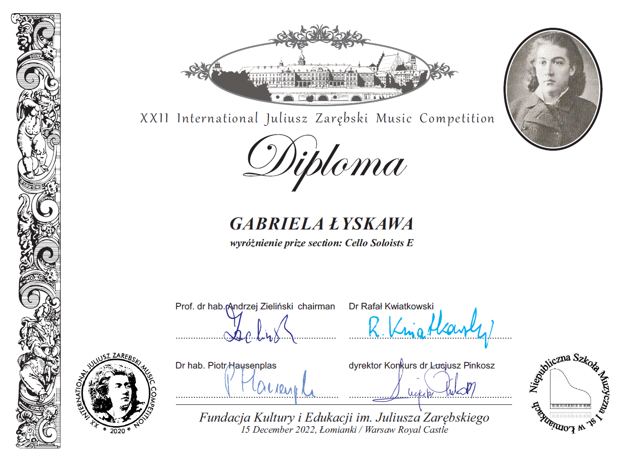 Po raz kolejny z wielką radością przekazujemy informację o sukcesie Gabrielii Łyskawy, uczennicy ALO Milenium, wielokrotnie nagradzanej wiolonczelistki. 9 grudnia Gabrysia została ogłoszona laureatką VII Ogólnopolskiego Konkursu dla Skrzypków, Altowiolistów, Wiolonczelistów, Kontrabasistów i Pianistów organizowanego przez Fundację Jana Romanowskiego w ramach Festiwalu FORTE. Serdecznie gratulujemy i życzymy kolejnych sukcesów – jesteśmy pewni, iż będzie ich jeszcze wiele!