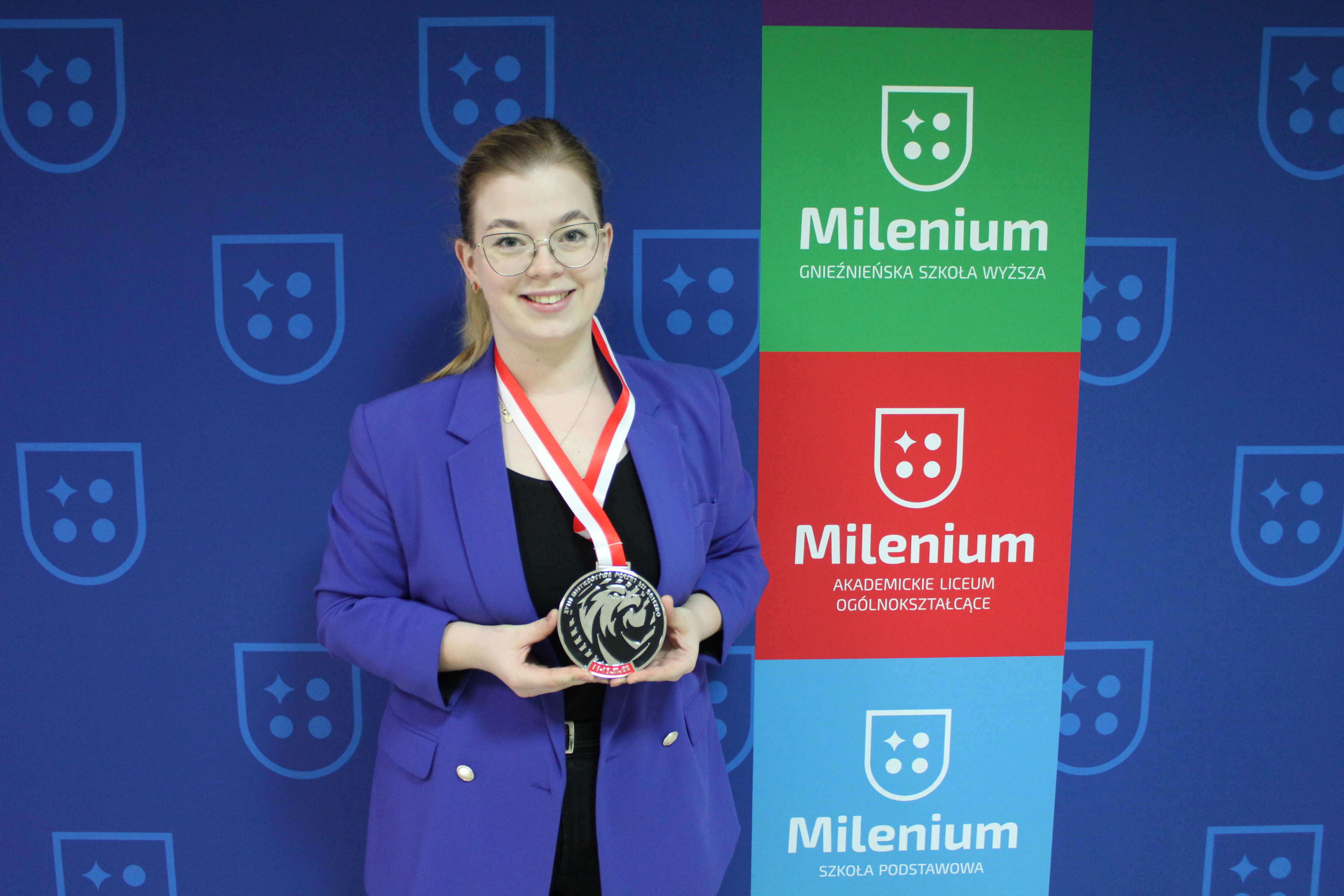 Nasza hispanistka, pani Magdalena Mądrowska, w ubiegły piątek 11 listopada wystartowała w XVIII Mistrzostwach Polski w brazylijskim jiu jitsu, które odbywały się w naszym mieście. W swojej kategorii, czyli kobiety/ adult/ białe pasy zdobyła srebrny medal! Pani Dyrektor dr Iwona Gawrecka osobiście pogratulowała pani Mądrowskiej, życząc dalszych sukcesów w rozwijaniu swojej pasji.