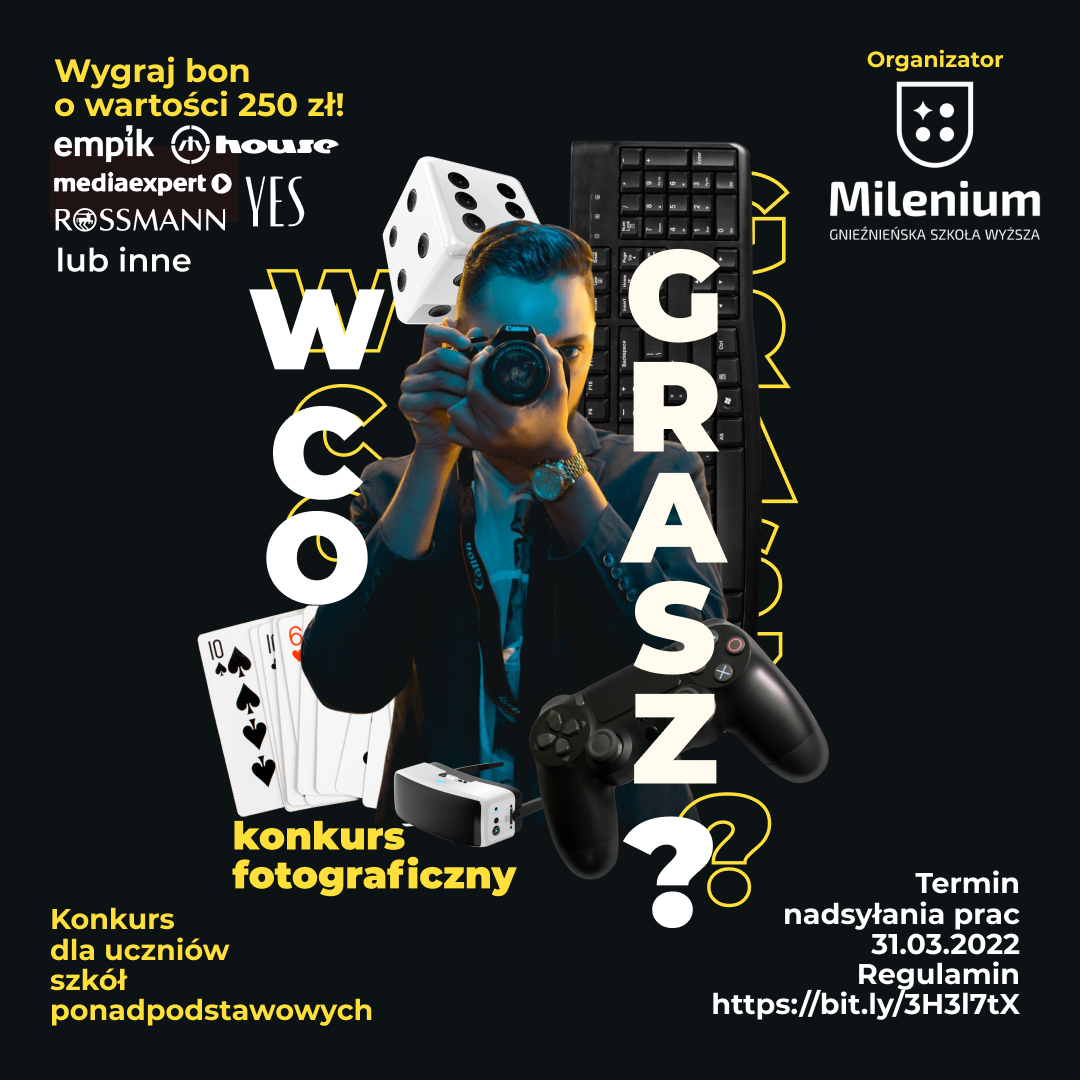 Biblioteka Gnieźnieńskiej Szkoły Wyższej Milenium zaprasza uczniów szkół średnich z Gniezna i powiatu gnieźnieńskiego oraz z Wągrowca i powiatu wągrowieckiego do udziału w międzyszkolnym konkursie fotograficznym "W co grasz?".