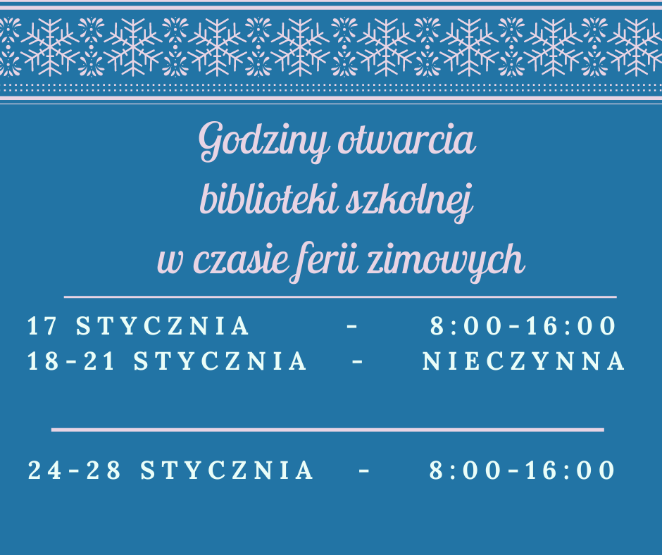 Informujemy, że w dniach od 17 do 28 stycznia 2022 r. (ferie zimowe) sekretariat szkoły będzie czynny w godzinach od 8.00 do 14.00.