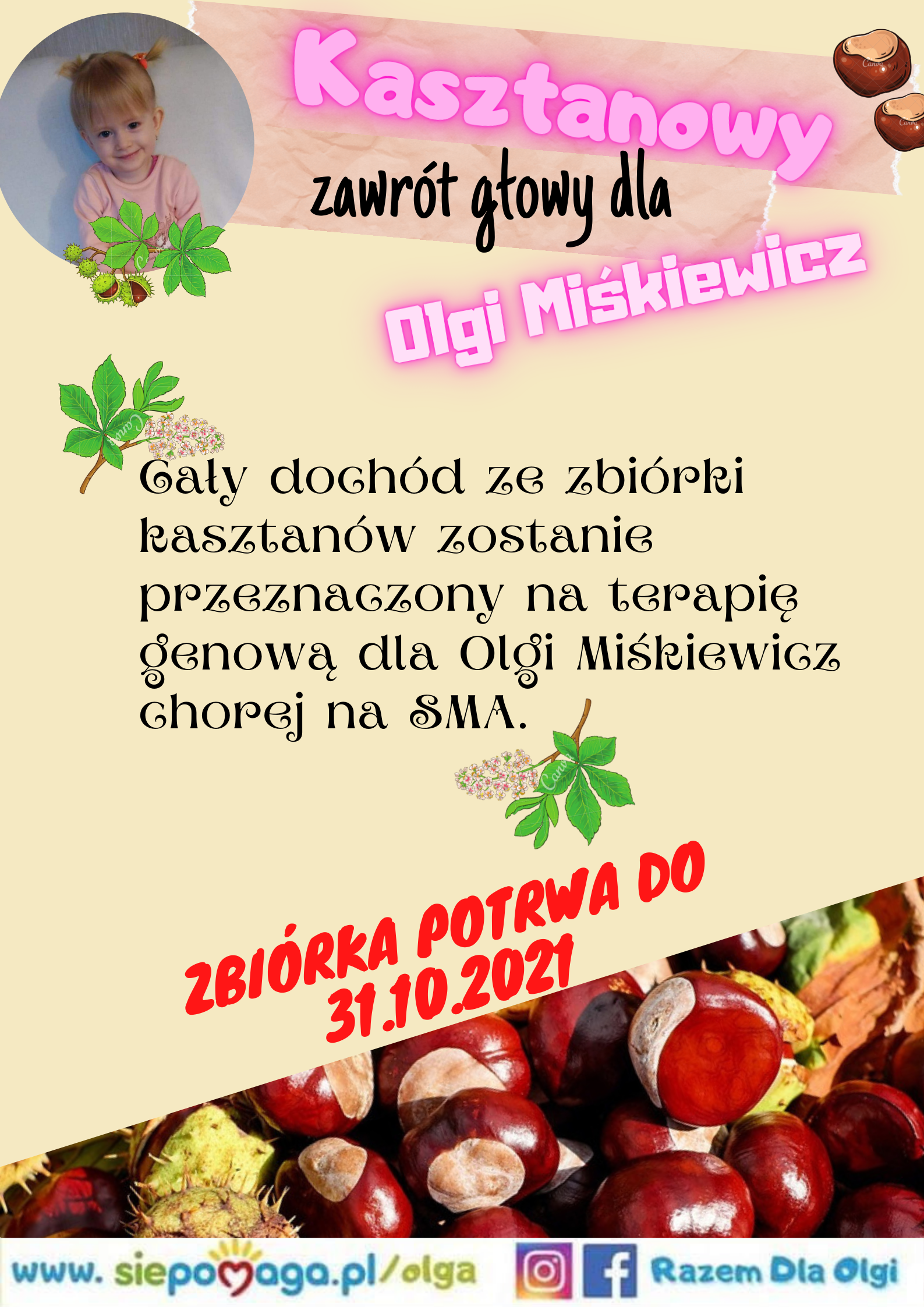 Przed wakacjami nasze liceum żyło zbiórką funduszy na leczenie małej Olgi z Kiszkowa, która potrzebuje pomocy w walce z SMA. Tym razem zachęcamy wszystkich uczniów oraz ich rodziny do udziału w akcji "Kasztanowy zawrót głowy dla Olgi Miśkiewicz". Chcecie pomóc? Zapytajcie o zbiórkę Panie nauczycielki z naszego przedszkola! Cały dochód ze sprzedaży kasztanów zostanie przekazany na leczenie dziewczynki - zebrano 68% potrzebnej kwoty, czas ucieka. Udostępniamy także link do skarbonki - KLIK